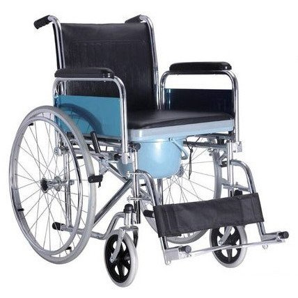 Supreme-608-46R commode wheelchair has a chrome-plated steel frame that makes it durable and includes a detachable and removable commode bucket that can cleaned after use. It has a durable and comfortable PVC cushion that works as a backrest. It can be easily transported in a small space and can be folded when not in use. It is used for walking around people with physical disabilities and using the bathroom.